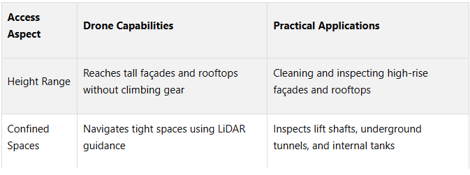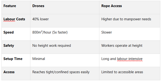 Drones excel at accessing locations that are challenging for traditional rope access methods. Here's how they measure up: